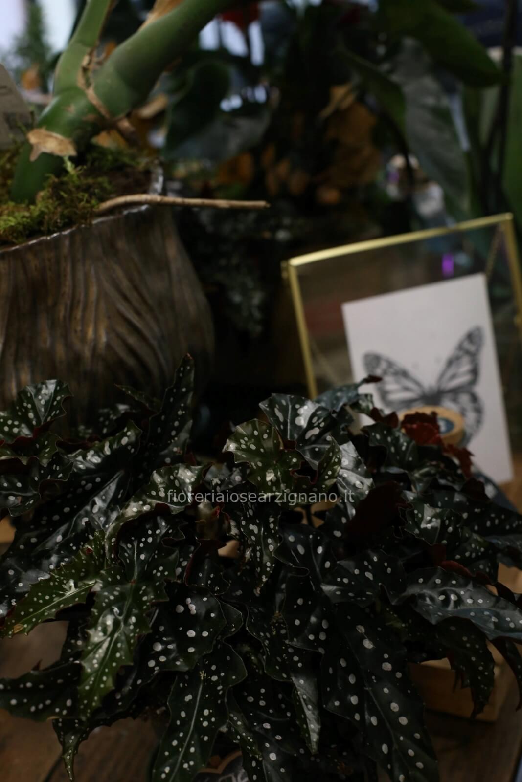 La Begonia Maculata ‘Black Forest’ è una pianta da interno di grande fascino, apprezzata per il suo fogliame scenografico ed elegante. Le foglie allungate, di colore verde scuro quasi nero, sono punteggiate da maculature chiare a contrasto, mentre il retro presenta tonalità più calde e profonde, creando un effetto visivo raffinato e ricercato.