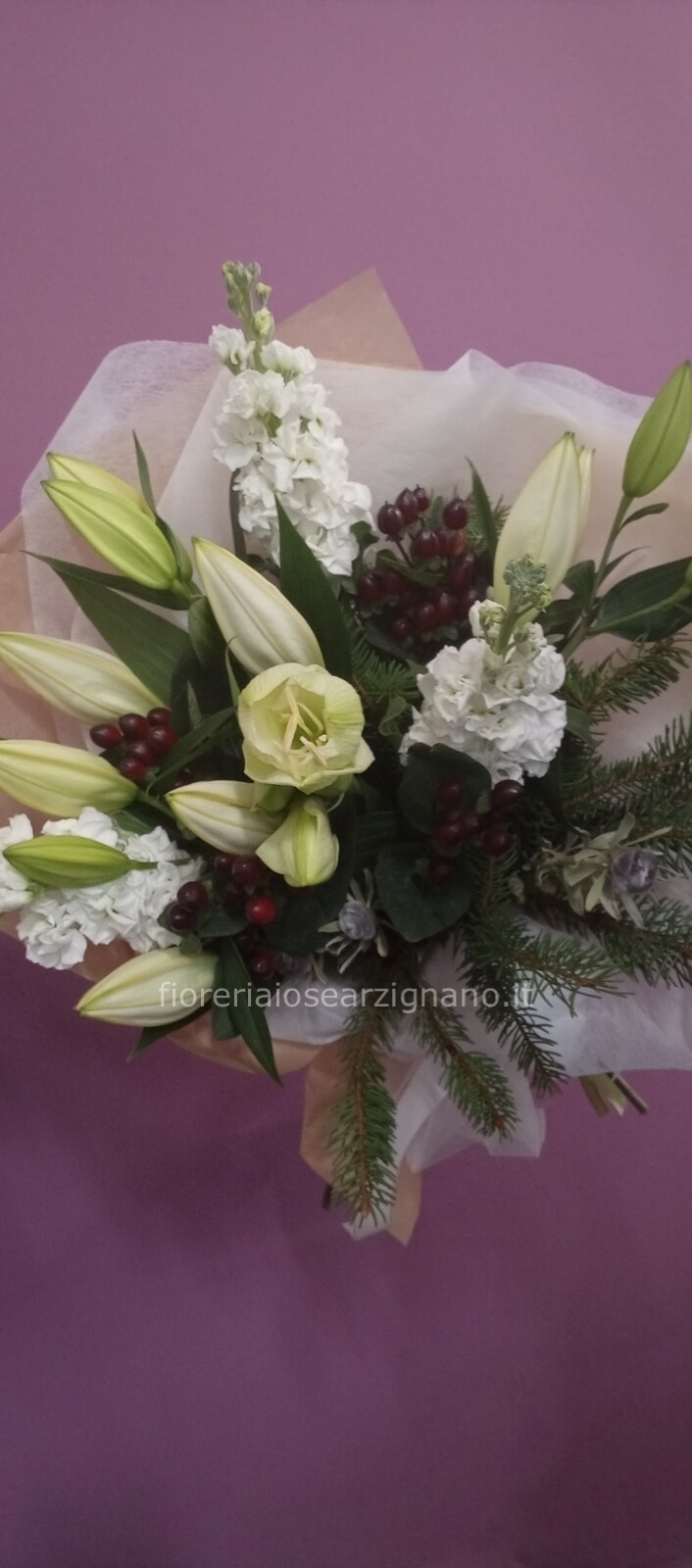 Un delicato e sofisticato design floreale per i momenti che meritano un tocco di eleganza. Il bouquet DICEMBRE è realizzato con fiori stagionali di alta qualità in una palette di colori misti sui toni del bianco e bordò — ideale per anniversari, per un grazie, nascite e compleanni